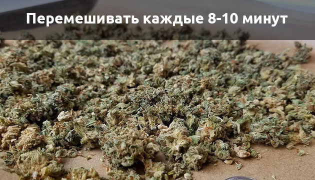 Пока шишки находятся в духовке, их следует перемешивать каждые 8-10 минут, чтобы масса прогревалась равномерно, а сам процесс декарбоксилирования проходил эффективнее.