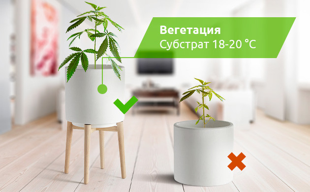 Самым холодным элементом в неотапливаемом помещении обычно является пол. При выращивании конопли в индоре, прежде всего, следует изолировать горшки от него. Неважно, на что вы их поставите. Можно изготовить небольшую подставку из досок или картонных коробок, поднять их на пластиковые ящики или пенопластовые листы, которые используются для теплоизоляции дома. Главное, чтобы этот материал плохо проводил тепло и выступал в роли барьера, ограждающего корни от суточных перепадов температур.
