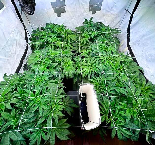 Как бы там ни было, на 38-й день крона почти полностью закрыла сетку, и кусты начали активно вытягиваться уже ввысь, борясь за место под лампами. Решил снять первый ScrOG и установить второй. Он обеспечит дополнительную поддержку во время цветения и поможет скорректировать форму, чтобы растения не переплетались между собой. Также добавил осушитель воздуха в бокс, потому что влажность начала подниматься выше комфортного уровня.