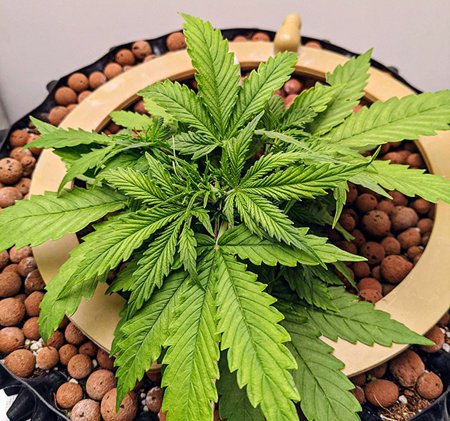 На пятой неделе я отключил полив на два дня, так как растишка выглядела слишком залитой. О чрезмерном поливе сигнализировала и высокая влажность – 75 %. Поэтому, когда я возобновил полив дважды в сутки, я поставил в тент небольшой осушитель воздуха. Таким образом, удалось снизить влажность до приемлемых показателей. Также я заметил признаки дефицита кальция, поэтому увеличил количество CalMag в растворе до 10 мл/л и продолжил обрабатывать лёгким раствором “КалМага” по листу. Несмотря на перечисленные проблемы, растение выглядело хорошо, я бы сказал, на 8 из 10. Оно было невысокое и очень густое, из-за чего свет плохо проникал в нижние ярусы растения. Благодаря LST и надлому на ранней стадии “Горилла” сформировала восемь ветвей, а центральный стебель был очень крепким.