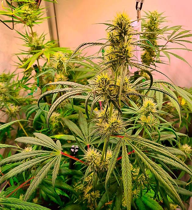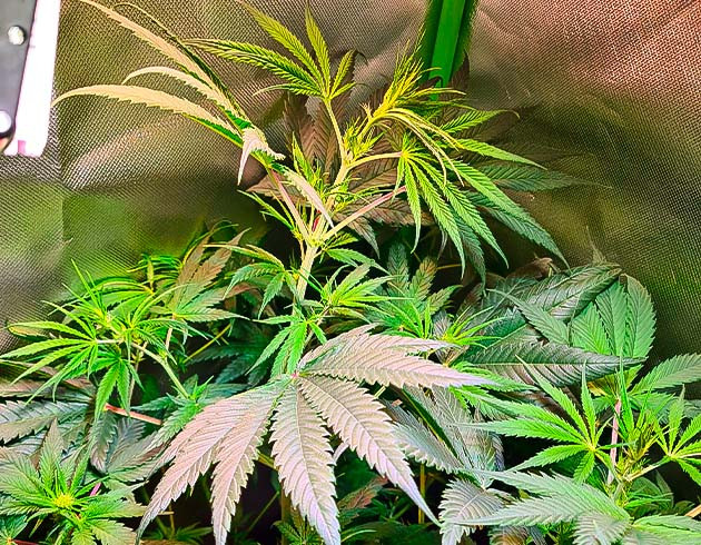 Цветение началось и идет хорошо. Листвы становится все больше, а соцветия постепенно формируются. На седьмой неделе пришлось прибегнуть к дефолиации и LST-подгибу. Растишки отлично перенесли тренировки, никаких признаков стресса я не наблюдаю. По высоте они уже вытянулись до 58 сантиметров.