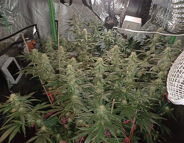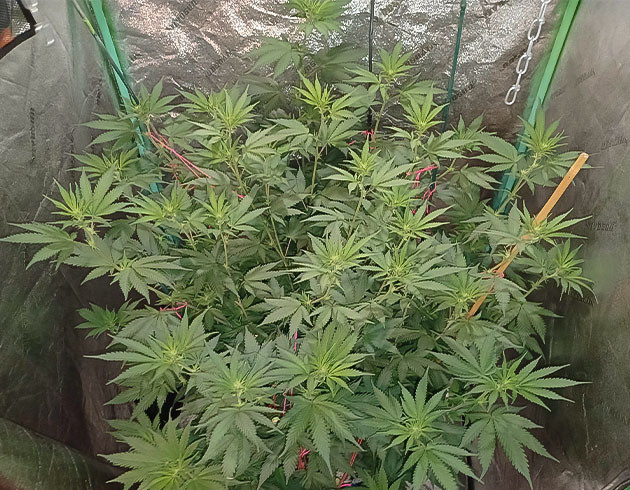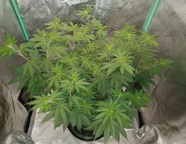 Девятая неделя, перевод в цвет, то есть смена светового режима на 12/12. К этому моменту рост куста по самой высокой коле – 66 сантиметров. Остальные плюс-минус той же длины. На 57-й день полив с удобрениями, Tiger Bloom 2,6 мл/л и Mammoth P 0,2 мл/л. Следующий полив на 59-й день с «КалМагом» и Mammoth P, без «Блума». На 61-й день полив с «Блумом» и через два дня еще один, но уже без «Блума». Получилось 4 полноценных полива за неделю. На 62-й день я заметил, что воздух в палатке очень спертый, а влажность невероятно подскочила. Причина была в забитом предфильтре, из-за чего кустик практически не получал свежего воздуха. Почистил, и всё встало на свои места.