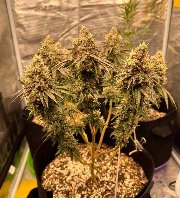 Следующие три недели я продолжал стабильный уход и применил LST-подгиб. Куст не выказывал никаких признаков стресса и хорошо реагировал на удобрения. Забыл до этого указать, что расстояние между верхушкой растения и лампой составляет 40 сантиметров. Также стоит отметить присутствие сильного травянистого аромата еще до начала цветения, что очень необычно для меня.