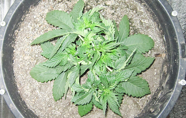 На 2-й день пятой недели от каски свет переведен на режим 12/12. Хорошенько подстриг листву, проредил куст процентов на 40-50, но оставил часть нижних лопухов. Поливал раз в два дня по 2 литра со слабой концентрацией буйских (5 мл/л). Растиха быстро пришла в себя от дефолиации и начала стрелять в рост.