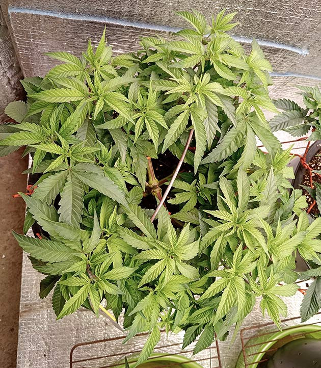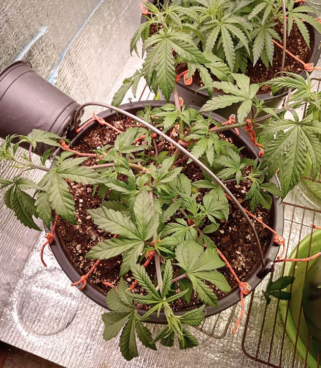 За последнюю неделю растение стремительно ушло в рост. Применили технику LST + Topping на 5-м этаже. Куст отреагировал хорошо, что говорит о стабильности генетики автоцвета. Растягивал растение на сухую, ибо мокрые ветки трескаются и не поддаются формированию. После LST обильно полил до выхода дренажа. Из дренажных отверстий должно вытекать минимум 20 % от вносимого объема компота. В моем случае в 20-литровое ведро было влито 5 литров, а дренажа натекло 1 литр. Состав компота: «Жижа Вега» 1,5 г/л + VitAminka 0,7 мл/л. pH 6,3, ppm 450. Допом по листу дал Bud Monster 0,3 мл на 300 мл воды.