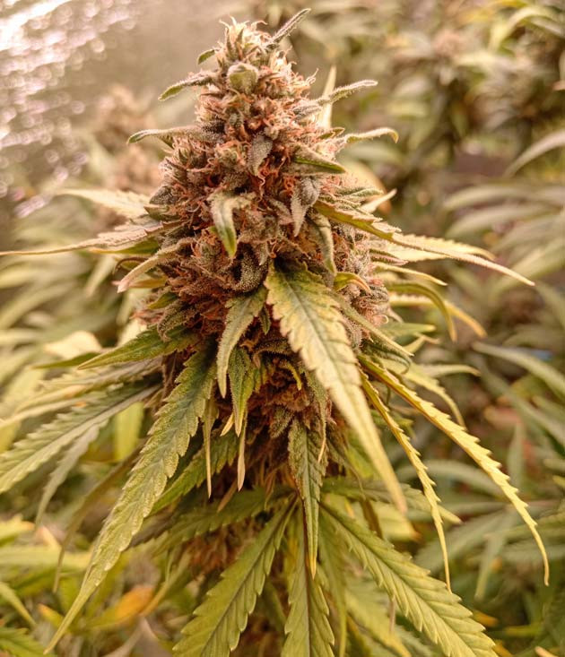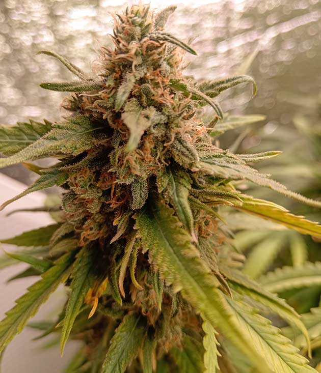 Каннабис созревает, набирает массу, активно покрывается трихомами. Кстати, желез довольно много для автоцветущей версии растения. Очень красивое растение с прекрасной структурой шишек и прелестными оттенками.