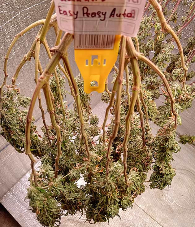 Если сравнивать Easy Peasy Auto с другими растениями этого цикла, то этот автик впечатлил меня больше всего. Самый крепкий, крупный и в то же время урожайный куст. Полностью облитые смолой шишки по весу затянули на 221 грамм, и еще 39 граммов тримма осталось.