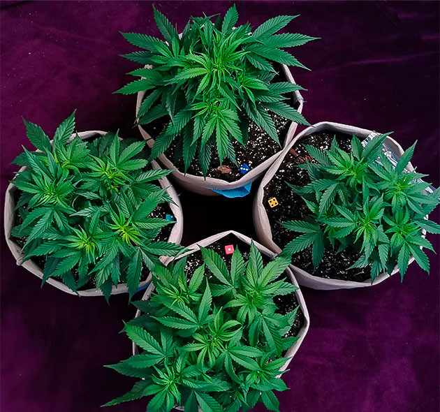 К пятой неделе кустики заметно приободрились и стали выглядеть гораздо лучше, если не учитывать изначальную разницу. В этой связи я принял волевое решение и сделал топпинг на двух кустиках, которые выглядели лучше и больше. Также я растянул все четыре растения, аккуратно развел ветви, чтобы лишнего стресса не было. В середине недели сделал лёгкую дефолиацию и был в целом приободрен камбеком, который сделали растишки. Если честно, то я уже решил, что мой второй опыт будет неудачным. Не тут-то было! Начал поливать по схеме «удобрения – чистая вода – удобрения» с перерывом в сутки, лью по 350 мл, что точно немного для горшков по 15 литров. Иногда кажется, что почва даже суховата, но недолив явно лучше перелива. Удобрения те же, в том же количестве, по 3 мл/л Micro, Grow и Bloom.
