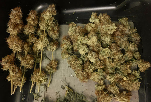 Наконец я дождался оптимального сочетания мутных и янтарных трихом. Перед сушкой я только убрал уже омертвевшие и завядшие листья, но часть здоровых оставил, чтобы вода из соцветий уходила не так стремительно.