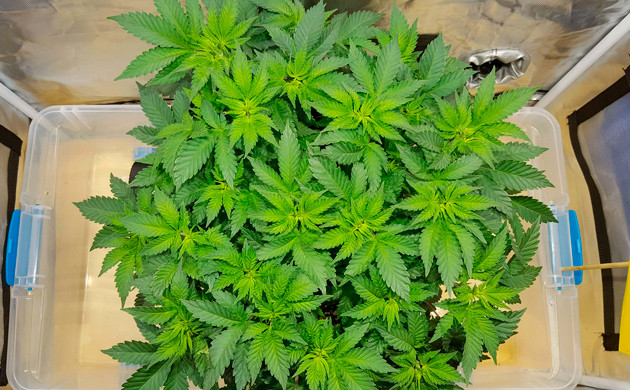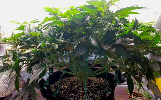 С девятой недели увеличил полив до 5 литров в сутки, растиха не проявила никаких признаков перелива и с удовольствием впитывает такое количество воды с удобрениями. Кустик заметно прибавил в росте. Его размер составлял 55 сантиметров. Осталось еще немного тренировок, возможно, суперкроппинг, а также аккуратно распределить колы в ячейки сетки, чтобы заполнить всё пространство.