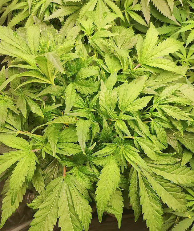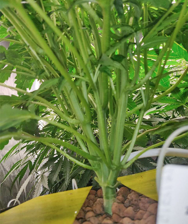 На шестой неделе я заметил одну особенность кустика: он растет исключительно вверх, практически не разрастаясь горизонтально. Попробовал немного разогнуть ветви, но пришел к выводу, что уже поздно и в этом нет особого смысла. А еще его листья выглядят действительно странно. Обидно, что я не могу с уверенностью сказать, связано ли это с повреждением при проращивании либо же особенность генетики сорта. Высота растишки 40 сантиметров, и она вот-вот зацветет. Условия в гроубоксе следующие: