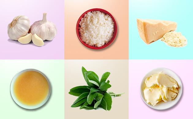Разложите ризотто в тарелки, сверху добавьте небольшое количество масла шалфея и положите по паре хрустящих листочков из этого масла. Есть нужно сразу, пока ризотто теплое, сливочное и кремовое.