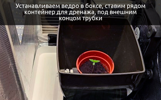 - Устанавливаем наше «конопляное ведро» в боксе и ставим рядом небольшой контейнер для сбора дренажа прямо под внешним концом трубки. Удобнее всего использовать вытянутые прямоугольные емкости. Ориентируйтесь по размерам своего рабочего пространства, чтобы эта емкость не занимала слишком много места. Средний объем этого контейнера должен составлять 8-10 % от объема самого ведерка.