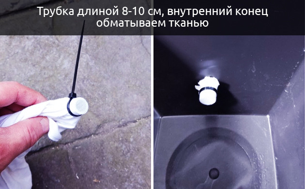 - Отрезаем кусок трубки длиной 8-10 см и с внешнего конца делаем небольшой желоб, чтобы слив шел ровно.
