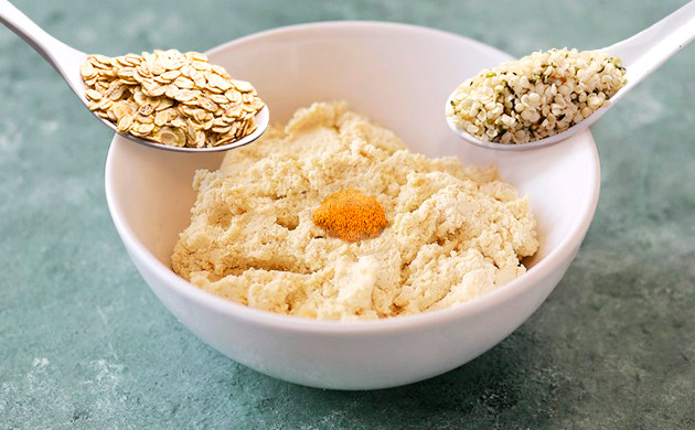 Тофу протирается через сито и смешивается с конопляным семенем, овсянкой и специями.