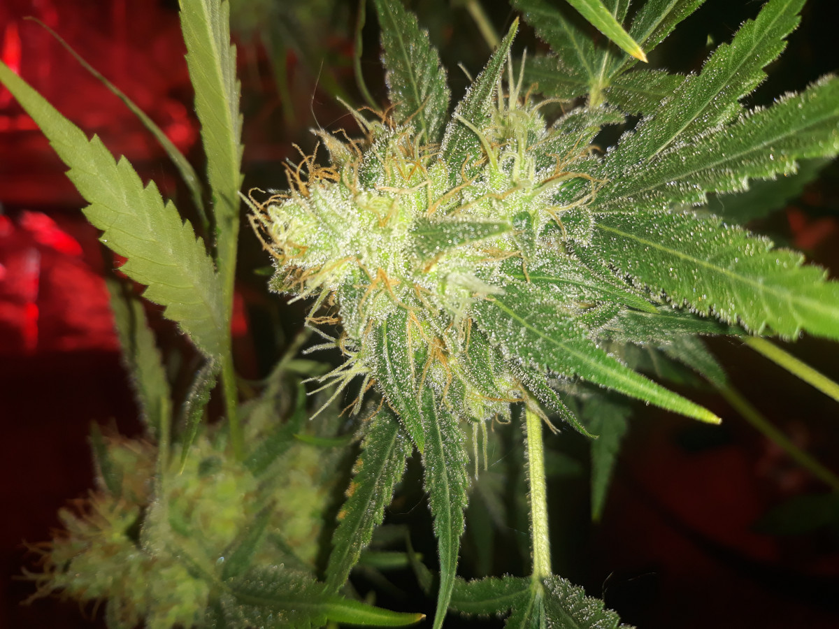 Через месяц перевода на цвет отключили отопление и влажность поднялась до 60%, плюс за три-четыре недели до харва зарядили постоянные дожди которые поднимали в комнате до 70% и в боксе соответственно выше 90%. Уже опасался что заведется плесень, ибо гребаный китайский вентилятор на обдув сдох, пришлось быстро ставить USB кулер из под ноутбука, слабенький ветерок хоть был и ладно. За неделю-две до предполагаемого харва сдох ёще и канальный вент на вытяжке, еле дождался 70% процентов коричневых пестиков и срезал пока плесень не началась, от греха подальше. Под микроскопом трихомы в основном были мутные и немного светлых, только на паре шишек заметил 1-2 янтарных.