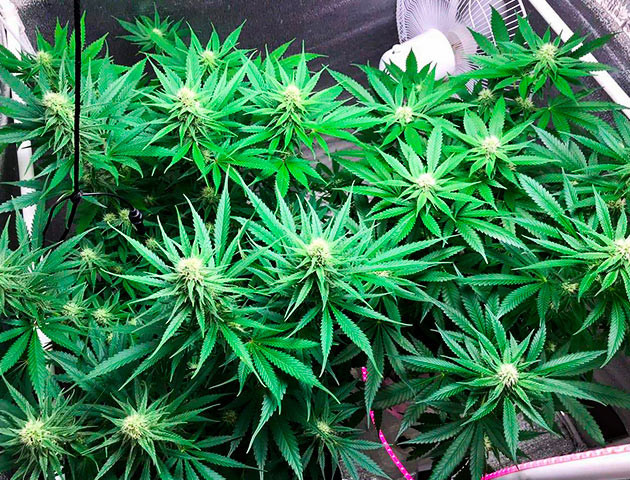 Были и топпинг, и дефолиация, и скрог, и растения прекрасно на все реагировали, развиваясь шикарно. Стойкие и крепкие, можно сказать, что проблем особо не было. Разве что только на веге пара кустиков как-то отставали, особенно один был маленьким. Однако все выровнялось и уже буквально к 6-7 неделям мой бокс с гидроустановкой на 4 посадочных места стал напоминать джунгли. Очень энергичный сорт в плане развития и отклика на все мои манипуляции, и предсказуемый, что немаловажно. Зацвел быстро, уже спустя неделю после перевода в режим 12/12.