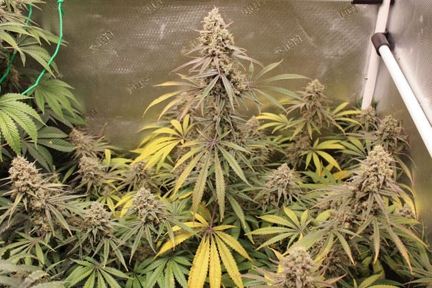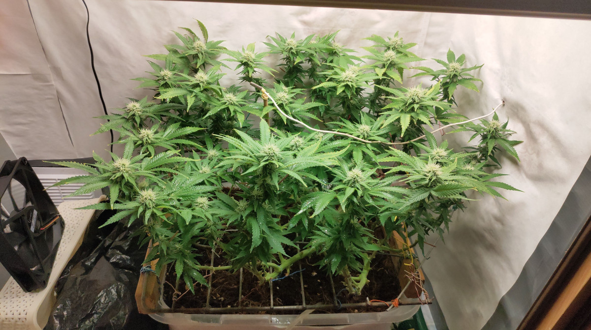На цветение решил переводить тогда, когда растение достигнет высоты в 50 см, и случилось это на 7 неделе. В 8 недель установил импровизированную сетку. Еще за пару недель куст дорос уже до 70 см. С 11 недели стал добавлять бустер цветения, и масса шишек стала активно нарастать. Вообще сорт прекрасно реагирует на все – на основной питательный комплекс, на свет, на бустеры. Мне даже пришлось сменить систему основного питания, так как старые удобрения закончились, и растиха отлично это перенесла.