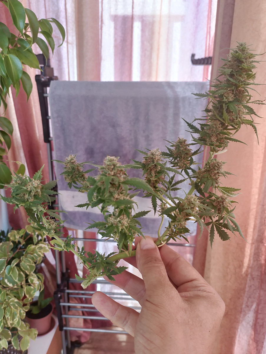 - Общие впечатленияРешил поделится своим впечатлением, о вдове, как то поднимал ее в боксе, сейчас вот увидев у буржуев, конкурс, где они поднимают кустик, в пивном стакане 0.5 решил попробовать, правда не нашел стакана, так как не пью и высадил в горшок 0.7, земля " сад чудес, роза" сад чудес лимон, и 30 процентов перлита. Пол чайной ложки микориза кормилица, перед посадкой пролил водой с милласой и фулвиком овсинский. Семечка проросла без проблем в воде и перекиси без проблем за ночь и была отправлена в горшок. Хоть и балкон солнечная сторона, и солнце с самого утра до 5 вечера светит, даёшь ещё часов на 6-8 она отправлялась в бокс, стояла бедолага скаю а потом отправлялась на балкон спать, когда шел и спать я. За 2 недели она стала, выглядеть для крошечного горшка, прямо красиво, полив был только вода осмос, туда добавлялся калмаг до 200 ппм, 0.3 гр фульвика овсинского. Пш 6.3. стал так лить наверно дня с 6 го, прямо кружкой 150 гр до дренажа. До этого лил грамм по 30, что бы не залить росток. На 2 неделях сделал лст и через 4 дня, она показала пол, а ещё через 5 появились первые одуваны. Поменял удобрения на цвет. Стал лить хеси на цвет и хеси буст. Так как она не могла уже вверх расти из-за объема горшка, фосфорное окно определил примерно. И состав кампота стал на кружку 200 гр. Калмаг плагрон 0.2мл, 0.5 мл база хеси на цвет, 03 мл буст на цвет хеси и так как мне сильно не хотелось дохнуть ее ПК, вместо ПК стал лить 05 хаммерхеад от адвансов. Ппм выходил около 650-700. Пш делал 6.3. из-за 30 градусов на балконе, и жары на солнце полив был каждый день. На 55 день просмотрев на трихомы, они были уже все мутные. Решил промыть и рубить. 2 полива были по литру воды просто осмос вода. Вы спросите зачем так заморачиватся, отвечу, хоть и есть пока курить, недавно поднял apple fritter, кстати за него тоже есть отзыв, но именно ощущения от вдовы и странно почему то от семяныча автика, хотя курил разные, нравятся больше всего. Особенно ее способность поправлять прямо на выдохе калпака. И дым напоминает вкус детства, я бы так сказал, не эти все новомодные ананасовые экспрессы, а именно он прямо такой же, как купили когда то через папиросы Казбек. Дальше мои восторги по эффекту от вдовы, с нее сразу пропадают все мысли и хорошие и плохие. Просто в голове пустота и безмятежность. Так что сорт этот очень люблю и рекомендую. Да и приятно его иметь в своей " планотеке", я что поднял, коллекционирую себе по шишек и вдова там занимает почетное место. Спасибо семянычу за сорт. Вот скоро высохнут и мои шишки))