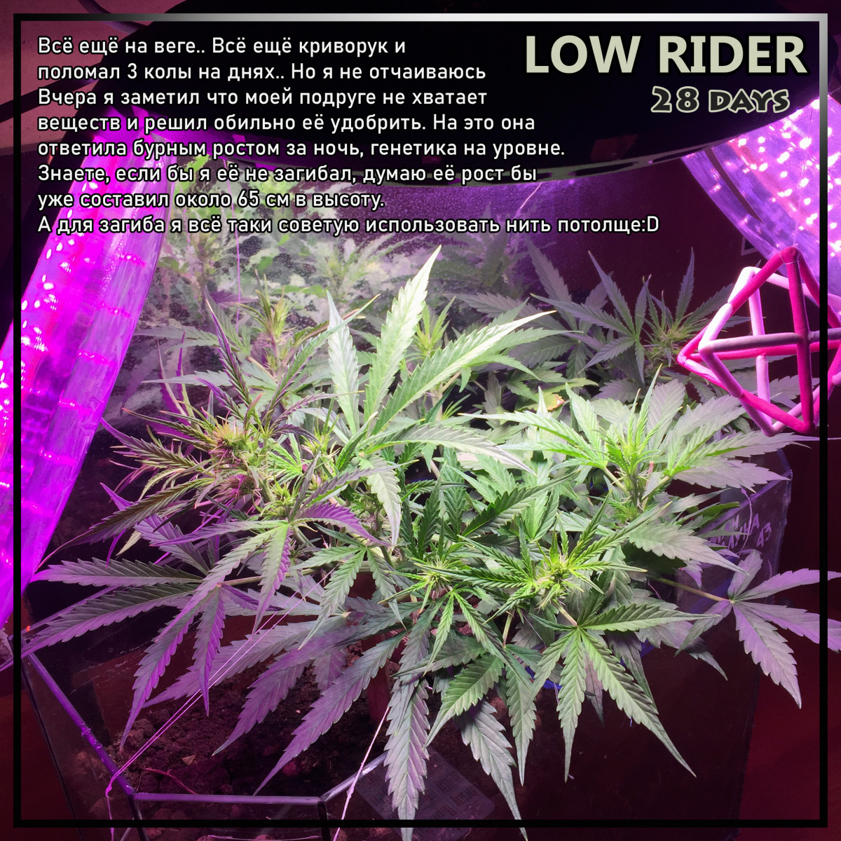 - Общие впечатленияПолевые заметки вы можете наблюдать на фото ниже. Выросла девушка как по паспорту, ей потребовалось ровно 60 дней. В принципе подержать ещё было можно, но мне хотелось сохранить в ней больше сативной лёгкости. Лампы LED 100 Вт если сложить все 3 штуки, каждая светит в своём спектре. Удобрял на всех стадиях обычной органикой для цветов за 110р из садового магазина. Поливал чистой артезианской водой примерно по 1л воды через 2 дня в течении месяца, и раз в 2-3 дня по 1,5л по 2л по настроению. В сумме у меня получилось собрать с 1 куста около 60 - 70г вкусных.